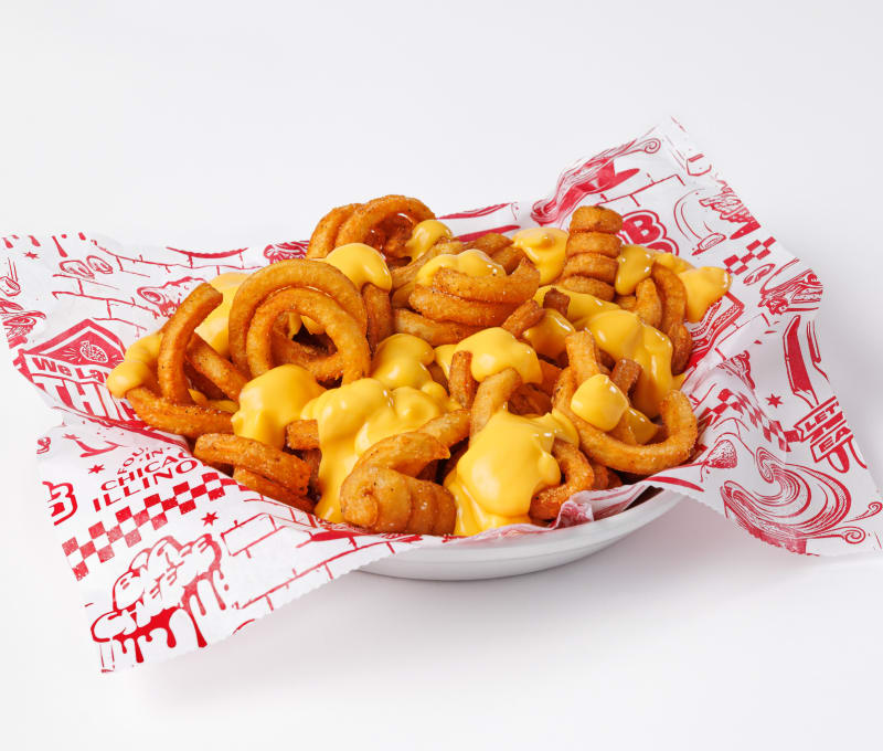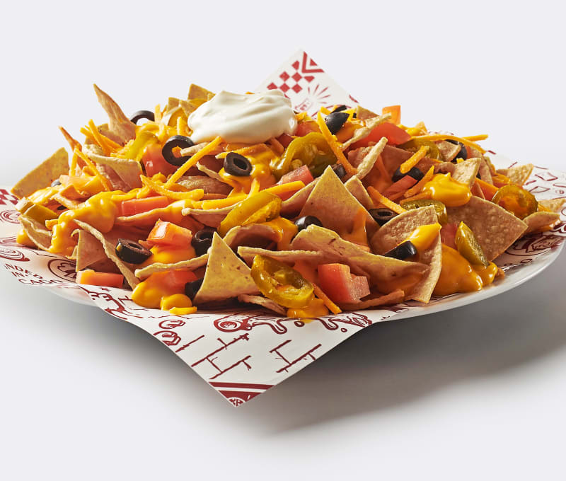 Cheddar cheese, cheese sauce, sour cream, black olives, tomatoes, and jalapeños with the option to add ground beef.