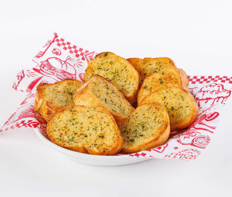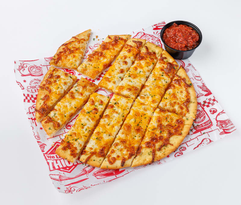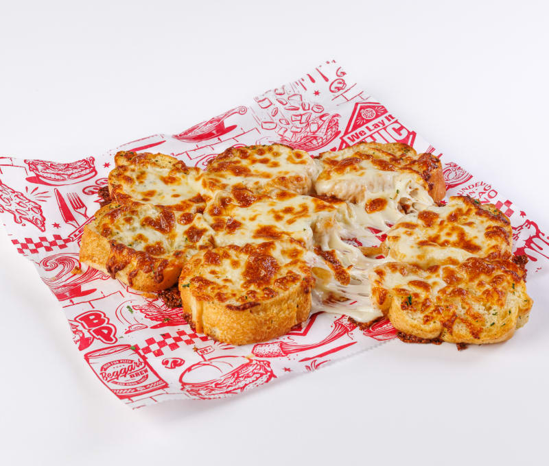 Pizza crust with garlic butter, seasoning, mozzarella, cheddar and parmesan.