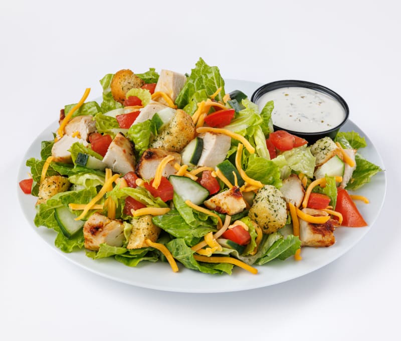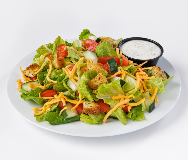 Romaine lettuce topped with cheddar cheese, tomato, cucumber, and croutons.