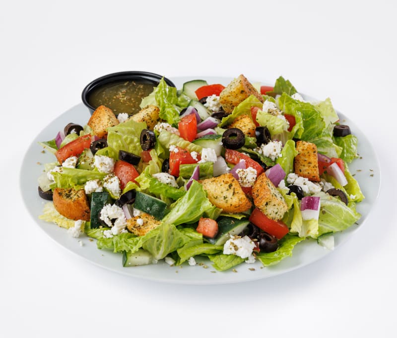 Romaine lettuce topped with feta, black olives, red onion, olive oil, oregano, and croutons.