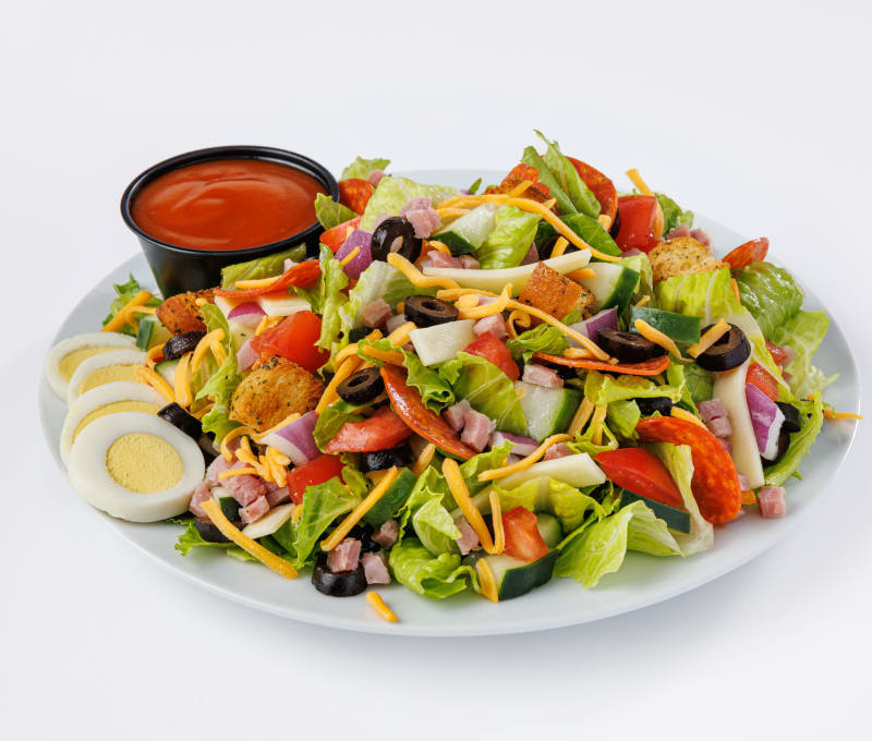 Romaine lettuce topped with cucumber, tomato, red onion, black olives, ham, pepperoni, hard-boiled egg, shredded cheddar, mozzarella, and provolone cheese.