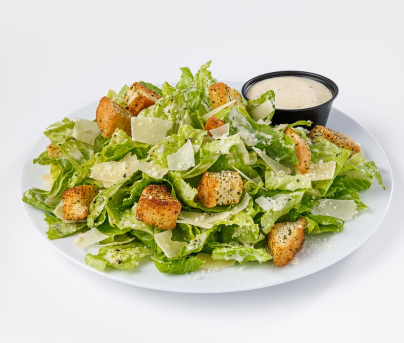 Romaine lettuce topped with Caesar dressing, shaved parmesan, grated Romano, and croutons.